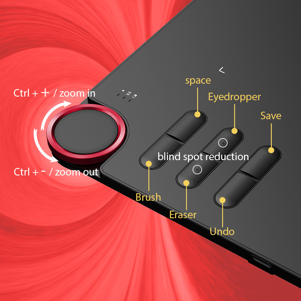 Deco 03 takes an incredibly creative design and refines it even further with a multi-function Red Dial. Crafted from anodic oxidation aluminum for a satin-like finish, this Dial is designed to fit comfortably in your hand and break through the traditional graphics tablet design. Utilize our multi-function dial by rotating its front and side. Easy to control with no friction.