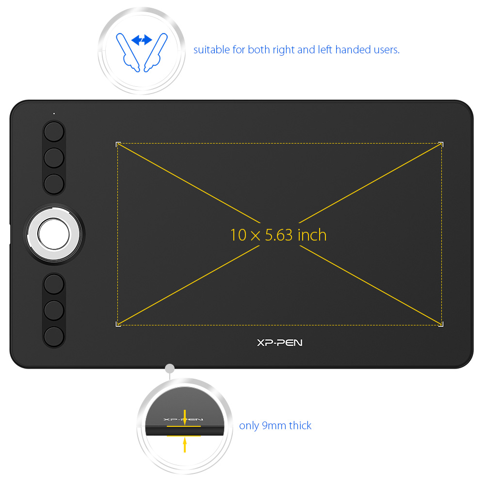 10 x 5.63 inch working area, offering you enough space to draw and create with ease. Six round, customizable shortcut keys that fit easily to your finger tip for creating a highly ergonomic and convenient work platform.
