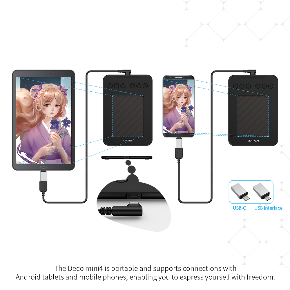 The XP-Pen Deco mini4 is compatible with Windows® 10/8/7, Linux (Detailed versions), Mac OS X® 10.10 (and higher),and Android 6.0 (and higher), and Chrome OS 88.0.4324.109. The tablet also works with major software, including Photoshop®, SAI®, Painter®, Illustrator®, Clip Studio®, GIMP®, Medibang®, Krita®, Fire Alpaca®, and Blender® 3D.