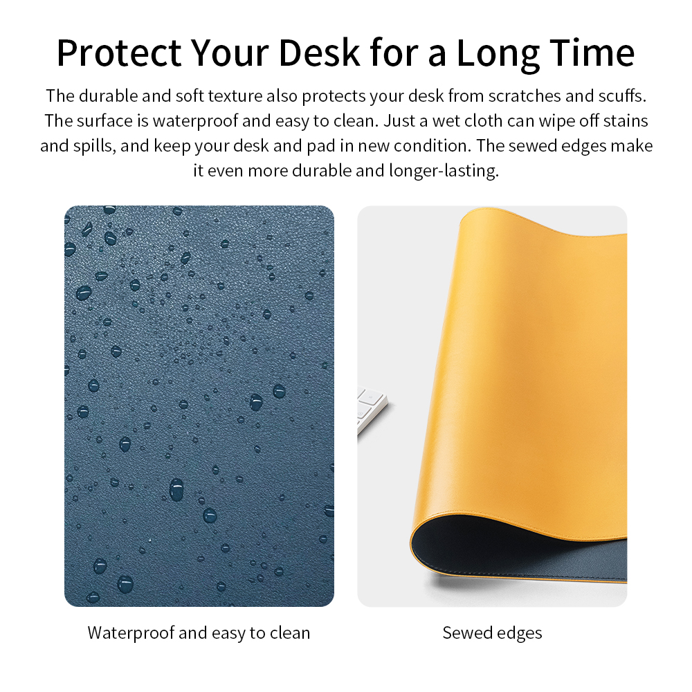 The durable and soft texture also protects your desk from scratches and scuffs. The surface is waterproof and easy to clean. Just a wet cloth can wipe off stains and spills, and keep your desk and pad in new condition. The sewed edges make it even more durable and longer-lasting.